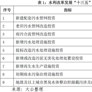 水务企业具有明显的区域垄断性,进入壁垒较高,且投建水厂或污水处理厂投资规模较大且回收期较长,是资金沉淀性强的行业。由于投资规模大,水务企业的资产主要以非流动资产为主,流动比率和速动比率持续保持在较低水平。且近年来,随政策推动行业投资快速增加,2015年,“水十条”的落地将启动庞大的环保市场,其中工业废水处理、城镇污水处理、可再生水以及水环境监测等产业未来市场空间巨大。环保部环境规划院副院长吴舜泽预测,到2020年,完成“水十条”相应目标需投入资金超过5万亿元。2016年12月,国家发展改革委、水利部、住房城乡建设部联合印发了《水利改革发展“十三五”规划》(参见表1)。