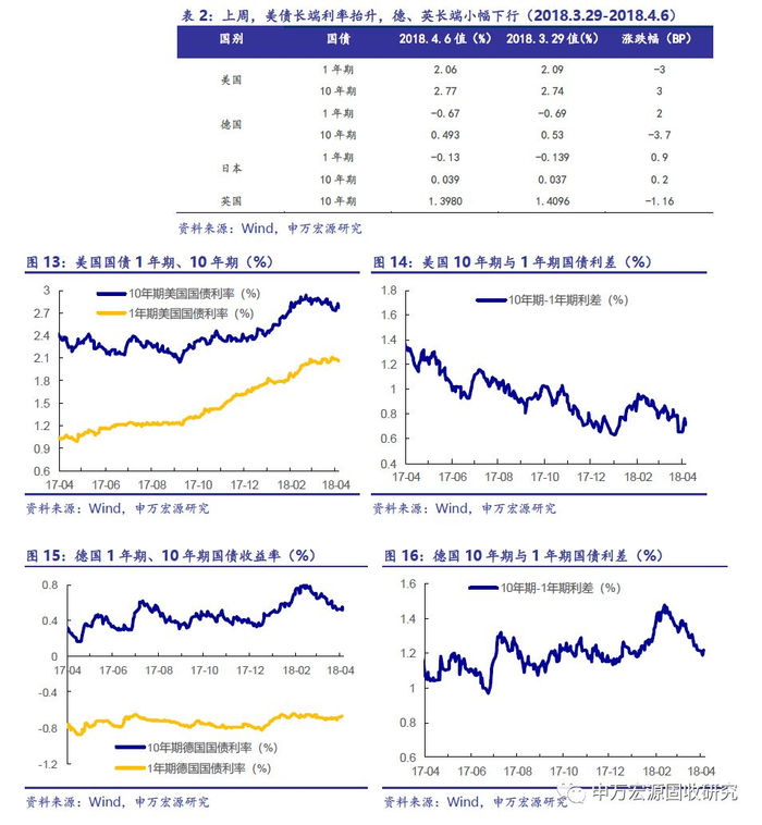 上周,美债长端收益率小幅抬升,德、英国债长端收益率小幅下行,短端利率整体较为稳定。美国3月薪资增速小幅抬升,鲍威尔公开演讲对通胀走势的表态中性,美国10年期国债收益率小幅上行3BP至2.77%。欧元区3月总体通胀与核心通胀均有所上升,但目前欧央行年内紧缩幅度难超此前市场预计,德国10年期国债收益率下行至0.493%。此外,英国10年期国债收益率亦小幅下行1.16BP至1.3980%,日本10年期国债收益率则小幅上升0.2BP至0.039%,变化幅度均不大。短端利率方面,美、德、英1年期国债利率均小幅波动,波动幅度在-3BP至2BP之间,美期限利差扩大,德期限利差进一步收窄。