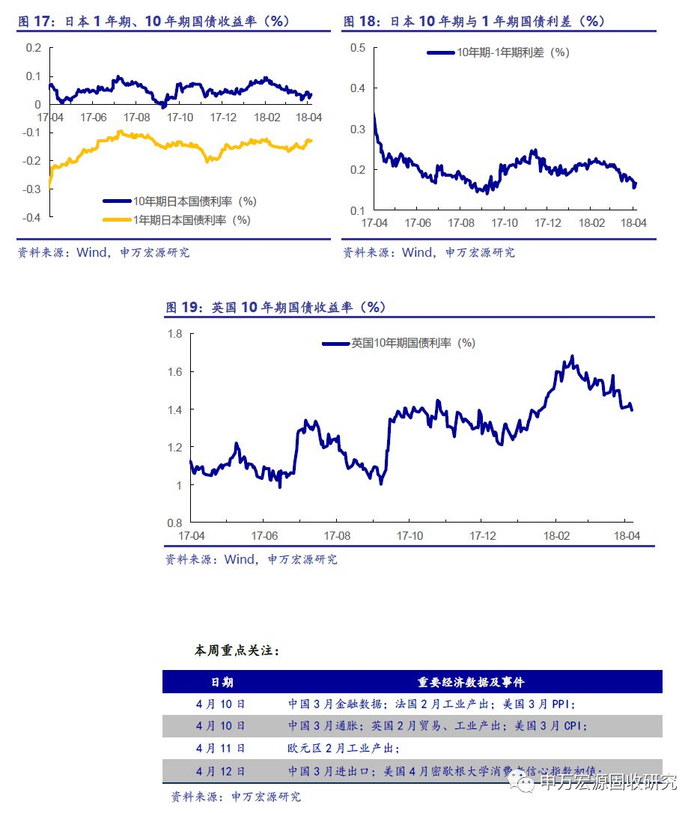 4月首周,资金面好转、贸易战升级、监管担忧弱化,债市继续好转并逐步向基本面回归。贸易战一波未平一波又起,6日特朗普声称将额外对1000亿美元中国商品加征关税,日内又表示出与中方协商的意愿,在中美贸易战出现显著转向前预计都将持续影响市场风险偏好。此外,关注下周公布3月通胀数据与社融数据,我们维持《回归基本面——2018年利率债投资策略》中的观点不变,2018年经济整体弱于2017年,伴随着监管政策的陆续落地,债市的聚焦点正逐渐回归基本面。经济下行+监管、通胀好于预期情况下,10Y国债3.4%-4%。继续看好2、3季度债市机会。