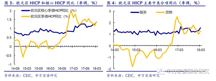 欧元区3月总体通胀与核心通胀均上行,表现强劲。欧元区3月总体HICP季调同比与核心HICP季调同比均为1.4%,均较2月上行0.2个百分点。分项中,食品价格同比大幅反弹带动货物价格同比回升,服务业价格同比小幅走高亦对通胀上行形成支撑。我们预计当前相对宽松的货币环境和强劲经济表现将继续对核心通胀逐步上行形成支持,并促使欧央行逐步启动缓慢紧缩周期。