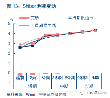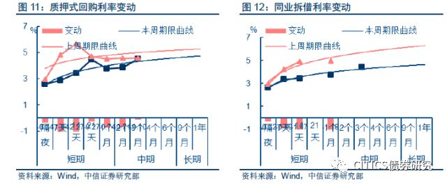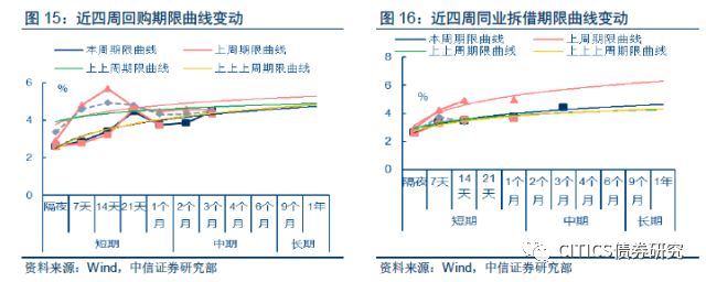 从回购曲线来看,上周回购利率全面下行,但短期利率下行幅度更大,期限曲线呈变陡峭。从同业拆借期限结构来看,较长期限的拆借利率下降幅度更大,期限曲线变平缓。