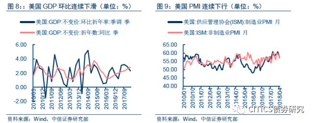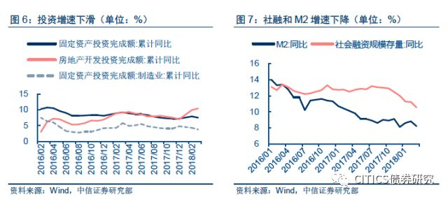 内部环境则主要在于去杠杆和稳增长的平衡。随着2017年金融去杠杆的持续深化推进,实体经济受到一定冲击,经济出现一定下行压力。PPI快速回落使得制造业投资和房地产投资增速出现回落迹象;金融监管加码,商业银行表外非标业务大幅收缩,社融增速下行对实体经济融资构成一定压力,M2增速大幅降低,去杠杆持续深化推进。