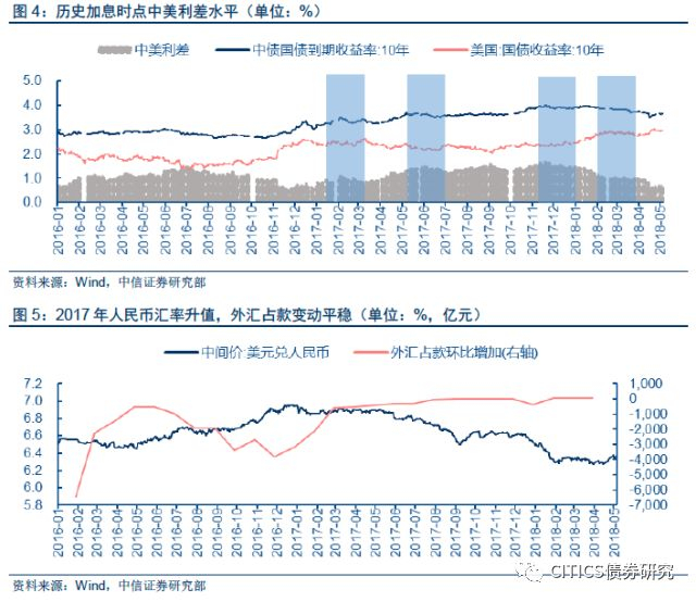 基于对内外部因素权衡,人民银行决定是否跟随美联储加息以及配套的政策。2017年2、3月份加息10BP主要是因为中美利差在于低位,经济基本面表现较好。2017年12月和2018年3月小幅加息并进行数量工具对冲,则更能体现人民银行权衡内外因素的考虑,小幅加息应对美债快速上行、抑制中美利差的快速收窄,数量工具对冲维持货币环境偏松。