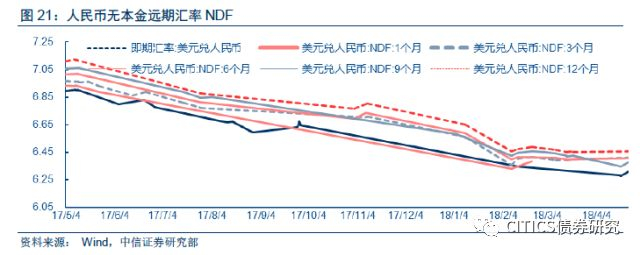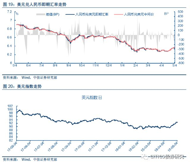 中美利差和人民币汇率是外部因素,对人民银行加息有一定影响。中美利差持续收窄确实给人民银行加息带来了一定压力。自2018年初以来,中美利差开始收窄,目前下行到60BP左右(见图4),而且随着美联储6月加息,中美利差有进一步收窄的可能。前文提到美国当前经济增长稳健,就业和通胀较为强劲,美联储6月加息概率极大;从更长的时间跨度看,美联储货币政策正经历着危机后的正常化周期,但美联储相机抉择会导致加息节奏的变化,中美利差当前的窄幅运行,人民币存在一定贬值压力(见图5),但未来走势存在不确定性。