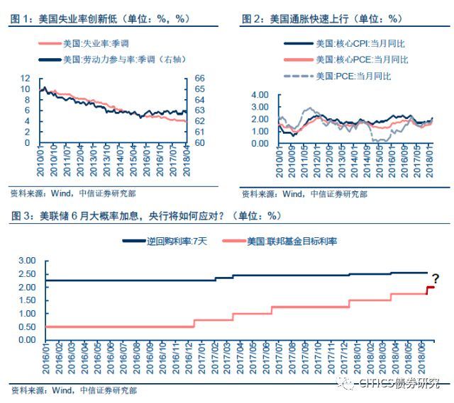 近期数据显示美国经济增长稳健、通胀和就业表现强劲,美联储6月加息已经箭在弦上。目前国内外因素成为制约和促使人民银行加息的两股力量,国内经济下行压力以及扩内需和降成本要求制约货币政策收紧;中美利差接近历史低位成为央行加息的支撑理由。除了内外部权衡外,长短期权衡货币政策后续操作空间和灵活性也很关键,主要是因为美国经济增长与通胀的矛盾在激化,美联储加息节奏出现一定的不确定性。我们认为比较中性的,也是大概率的政策组合是延续2017年底以来的政策,即加息5BP并结合MLF等公开市场操作进行流动性对冲。但根据国内经济形势亦步亦趋地加息,也不排除基于年中时点特殊性考虑而不加息,等待更加合适的时机。对债市而言,‘小幅跟随加息+数量对冲’或‘不加息’仍将维持偏松的货币环境,对应十年国债收益率回到3.4%~3.6%区间波动。