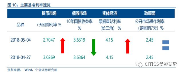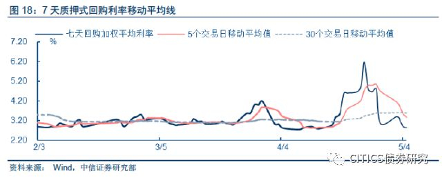 从7天回购的K线图中可以看出,上周(5月2日-5月4日)回购利率持续下降,且振幅较上周缩小,从上周三的3.40%持续下降到上周五的2.86%。