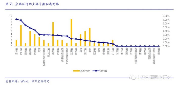 这是一个显而易见,但是却很容易被忘记的点。我们宜采用违约率而非违约个数或者金额进行统计。例如在统计省份违约情况时,北京违约主体数量为6个,数量排名全国第4,但这主要由于北京发债主体较多,而实际主体个数违约率仅为1.41%,全国排名17,并不靠前。而吉林恰恰相反,违约主体个数只有两个,但是看主体个数违约率高达7.14%,位居第一。因此如果我们采用金额或者个数,而不是违约率统计就会得出错误结论。