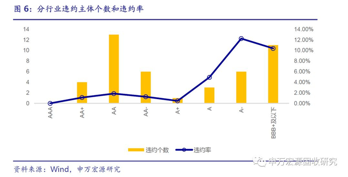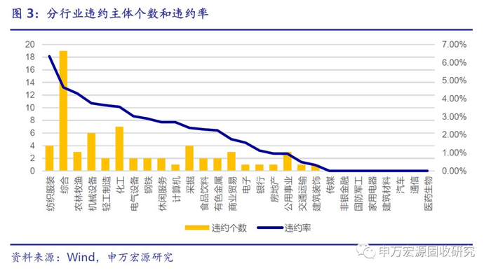 行业来看,主体个数违约率最高的为纺织服装、综合、机械、轻工和化工。违约主体个数来看,违约主体数量从多到少依次为综合、化工、机械、采掘、公共事业和商业贸易。
