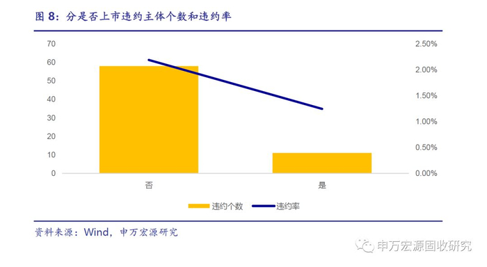 数量上看,非上市公司主体违约数量明显较多。但是从主体违约率角度看,非上市公司是2.19%,上市公司为1.24%,并没有直觉上相差那么大。上市公司相对于非上市企业而言其风险溢价来自于更透明的信息披露、更大的企业规模、股权融资渠道和壳资源。