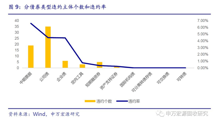 从违约率上看,外资企业债和虽然违约数量少但是违约率非常高。民企债从违约率和违约主体数量看无疑是最大头,违约主体数33个,主体个数违约率3.1%。地方国企案例8个,违约率0.65%。