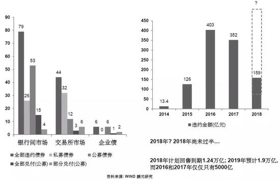 债券市场无法兑付到期本金和利息的违约行为始于2014年和2015年,在2016年和2017年迅速增长,其中2016年违约金额高达403亿元, 2017年达到352亿元, 进入2018年截止至今,共有19只债券到期兑付或者回售本息违约, 涉及总金额近159亿元, 但是2018年尚未过半,且2018年预计回售到期债券达到1.24万亿元, 2019年预计的金额为1.9万亿元, 远远超出往年5000亿元的平均水平, 债市踩雷风险和压力之大可想而知。