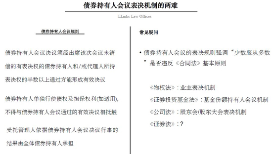 理想很丰满, 现实很骨感, 用来形容债券持有人会议制度可以说是再恰当不过了。兴致勃勃地参会, 仔细雕琢临时议案,群情激昂地声讨发行人,顺利通过一系列有利于实现债权的议案,就在一阵欣慰时,得到的却是发行人拒绝执行决议内容的回复,最终恍然发现债券持有人会议开完,除了和发行人、受托管理人见了一面以外,毫无收获。债券持有人会议和鸡肋无异, 几乎是所有债券持有人的观感, 具体来说: