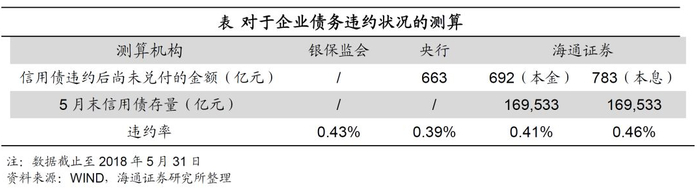 监管机构违约率计算方法。依照WIND资讯的数据,2018年5月末信用债存量约为17万亿元,其中包括了公司债、企业债、中期票据、短期融资券、超短期融资券、私募债和定向工具。我们对之前出现违约的债券进行统计,目前违约后未偿付的信用债本金约为692亿元,未偿付的信用债利息约为91亿元,两者合计约为783亿元。两者相比,可以得到目前发生违约后尚未兑付的信用债本金约占存量信用债的0.41%,尚未兑付的信用债本息和约占存量信用债的0.46%,与监管机构给出的数据相近。
