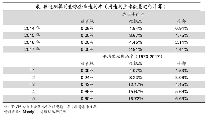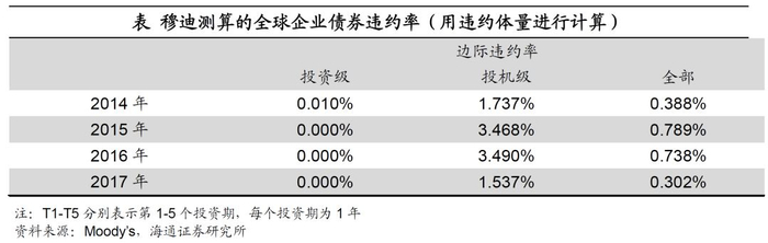此外,穆迪还有基于违约数额的违约率数据,其中2014年至2017年的全球企业债券边际违约率分别为0.388%、0.789%、0.738%和0.302%,而1994年到2017年的平均值为1.023%,中值为0.691%,目前央行测算的债券违约率约为0.39%,与其相比处于较低水平。(注:穆迪采用的是边际的概念,而央行则是存量的概念,可比性不高,后文有详细阐述。但央行剔除了已经兑付的金额,使得可比性又有一定提高,故此处作一个简单对比)