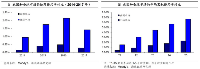 根据穆迪计算的结果,2014年、2015年、2016年和2017年全球企业的边际违约率分别为0.94%、1.75%、2.14%和1.41%,而同期的中国信用债违约率分别为0.14%、0.40%、0.48%和0.28%,明显低于全球平均水平。