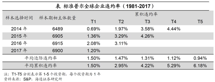 根据标普每年发布的年度全球企业违约报告,以2015年初选择的样本来看,在前1、2、3年的累积违约率分别为1.36%、3.29%和4.26%,我国的同期比例为0.40%、0.94%和1.28%,明显较低;另外,从平均累积违约率来看,第1个投资期到第5个投资期的全球企业平均累积违约率分别为1.50%、2.95%、4.22%、5.29%和6.18%,而同期的中国信用债平均累积违约率分别为0.39%、0.87%、1.34%、1.77%和2.27%,也明显较低。