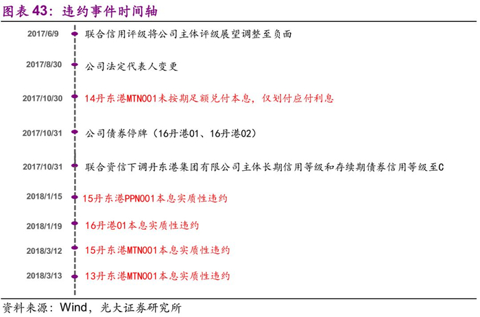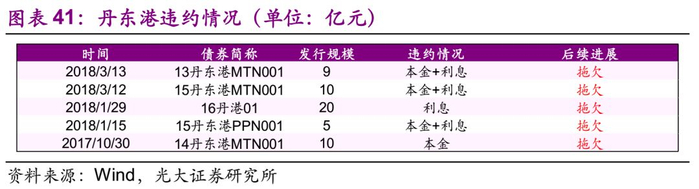 截至2018年7月13日,丹东港共涉入5起违约事件。“14丹东港MTN001”应于2017年10月30日兑付利息以及回售部分本金,但公司仅划付了应付利息5860万元,无法按期兑付回售部分本金;“15丹东港PPN001”,应于1月13日付息及兑付本金,未能筹集足额偿付资金;“16丹港01”应于2018年1月29日付息,由于公司资金紧张,未能按时支付;“15丹东港MTN001”应于2018年3月12日将本息划至托管机构,但未按时划转;“13丹东港MTN001”应于2018年3月13日将本息划至托管机构,由于公司有息债务负担重,短期支付压力较大,未能按时支付。上述债券均构成实质性违约。