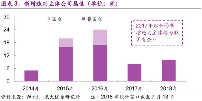 观察历年违约情况,我们发现债券违约的现象在2016年较为突出,新增违约主体数量以及新增违约债券规模均较多。2017年新增违约主体数量大幅减少,国有企业自2017年以来尚未出现新增违约情况,造成上述现象的根本原因是主管部门、相关政府对于信用违约的约束。从宏观的角度看,打破刚性兑付有助于金融市场更健康地发展;从微观的角度上看,债券发行主管部门、相关政府均不希望在自己的“辖区”中出现违约,因此一旦出现兑付危机均会大力协调。而2017年以来无新增违约的国企,我们认为可以从地方政府、流动性支持人角度进行分析。地方政府角度:对于国企,地方政府具有较多的协调可选项,而对于民企,地方政府可以用的手段相对有限,因此对国企的协调力度更好。流动性支持人角度:金融机构对于国企的“信仰”还在,因此愿意接受地方政府的协调,而对于民企相对“不信任”。