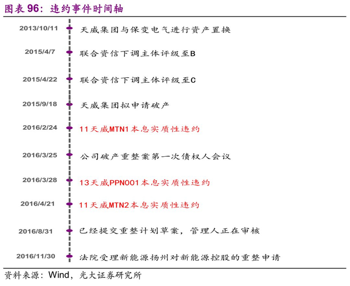 债务违约前重大事件有:1) 连续评级下调:联合资信下调主体评级至C;2) 核心资产被母公司剥离:实际控制人兵装集团对天威集团支持明显偏弱,并且通过资产置换、增发等方式,将发行人的优质资产置出。