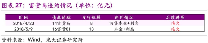 发行人富贵鸟为民营企业,截至2018年7月13日,富贵鸟涉入1起私募债违约事件、1起一般公司债违约事件。公司应于2018年4月23日兑付“14富贵鸟”回售本金和本期债券第三个付息年度利息,未按期偿付,构成实质违约;公司前期存在大额对外担保及资金拆借,相关款项无法按时收回,未能在2018年5月8日偿付“16富贵01”债券加速清偿应付的本金及利息,构成实质性违约。