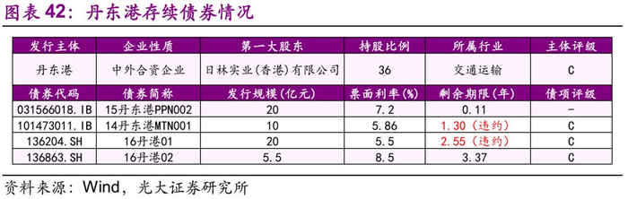 截至2018年7月13日,丹东港存续债券有4只,规模合计55.5亿元,其中“14丹东港MTN001”回售部分本金已违约、“16丹港01”未支付本息已违约,“16丹港02”、“15丹东港PPN002”等 2只债券均将于2018年内到期。