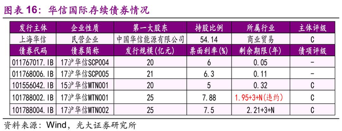 截至2018年7月13日,公司存续债券有5只,规模合计111亿元,其中“17沪华信MTN001”已违约。