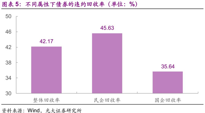 从回收率来看,整体回收率(各个主体违约率的算术平均值)为42.17%,国企为35.64%,民企为45.63%。