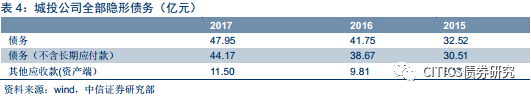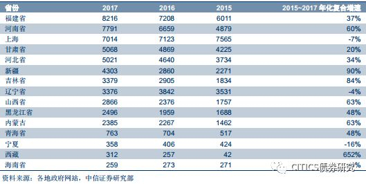 两种方法各有利弊,综合来看,我们倾向于使用负债端计算方法。2015年以来城投隐性债务增加速度明显。我们根据债券市场城投公司资产负债表测算,2015/2016/2017城投公司的隐形债务分别为32.52亿/41.75亿/47.95亿,2017年的城投债务比2016年仍然是增加的,而且增速不低。