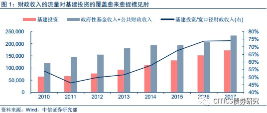 广义财政在基建上面的负担越来越重。基建投资虽然从2010年的20%下降到2017年的13%,但是从财政收入自给率上看实在逐步恶化,基建投资/宽口径财政收入之比从 2010年的50%左右上升到2017年的75%,也就是说,基建投资的增速要快于宽口径的财政收入。