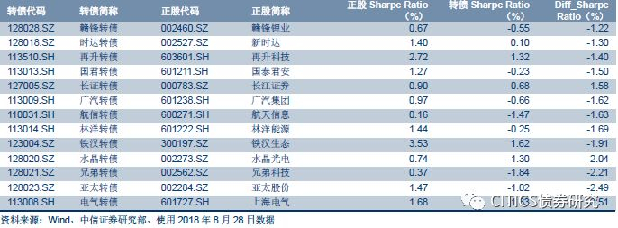 但信用风险本身偏向主观,虽然存在不少量化模型但相对而言较为复杂且涉及到较多假设,而前述也能看到债性标的与信用风险相关性更强。再次回到夏普比率模型的计算结果,以8月28日数据为例共有6只转债标的由于实际价格小于纯债价值无法计算隐含波动率,均为平价处于绝对低位的债性标的。