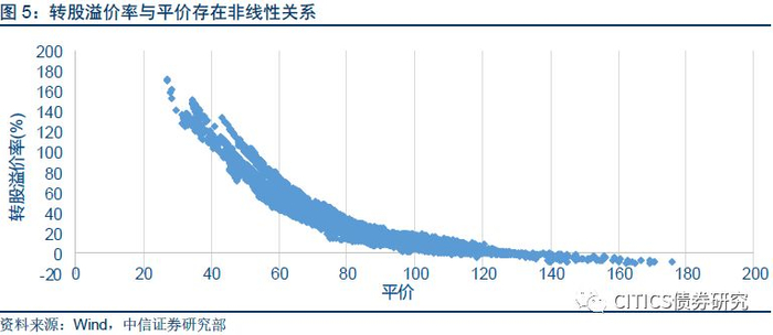 取而代之,我们直接分析转股溢价率与平价的实际历史数据,参考标的范围为2018年1月2日前所有上市转债标的,参考时间范围为2018年1月2日至今。将横轴设为平价,纵轴设为转股溢价率,我们试图通过散点图的形态把握两者的潜在关系。可以看到两者关系呈向下凹型,即一阶导数为负数,二阶导数为正数。从导数的背后含义来看,一阶导数为负数代表函数斜率为负,在转债价格相等的情况下,平价越高,转股溢价率越低;二阶导数为正数代表函数斜率呈单调递增,随着平价的升高,转股溢价率的变化频率也在加快。从背后逻辑来看,对于低平价标的而言,其转股溢价率处于高位,弹性不足,因而不能充分享受正股股价的抬升;对于高平价标的而言,其转股溢价率处于低位,充足的弹性使得正股股价抬升时溢价率可以较为快速的压缩。