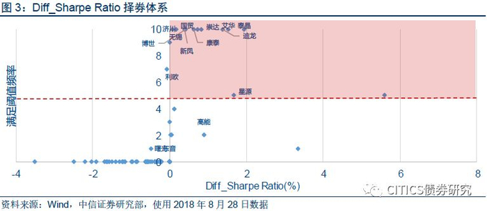 进一步细探个券的筛选,从基本逻辑出发,Diff_Sharpe Ratio的正负方向直接反映了转债与正股之间性价比的对比,因而我们将筛选阈值设为0,重点关注指标为正值的转债标的。另一方面,受制于实际价格和理论价格所存在的系统性差异,对个券而言单日数据可能会存在不满足阈值的情况,但此时并不意味着该标的不具备性价比。仔细观察个券层面的计算结果也能发现,在转债价格波动较大时,个券偶尔会出现期权价值为负值或转股溢价率被快速压缩的特殊情况,但此类情况通常持续时间较短,随着价格波动的缩小Diff_Sharpe Ratio也会逐渐回归至合理水平。为了尽量削弱此类情况给择券体系带来的干扰,我们将参考范围延伸至最近十个交易日,统计这一时间段内标的Diff_Sharpe Ratio指标为正值的频率。