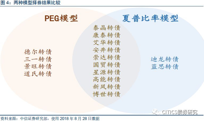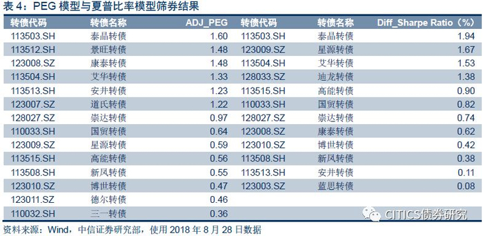 而分析框架的最后一部分则落地到了择券层面,在转债相较其余大类资产具有相对性价比的背景下,我们分别从个券的潜在涨幅空间以及风险调整后平均收益两个角度构建了PEG模型以及夏普比率模型。前述我们也曾详细解释了两个模型间相互依存的关系,不管是从出发点还是重点覆盖标的范围两者均存在一定差异,倘若单独使用其一可能会出现一定误区,唯有将两者结果相结合进行参考才能提供更为全面的择券建议。