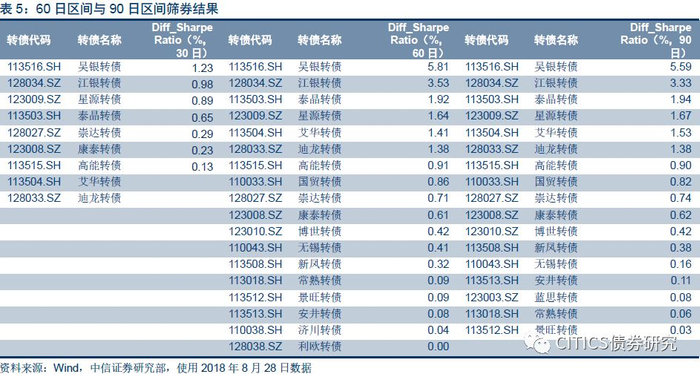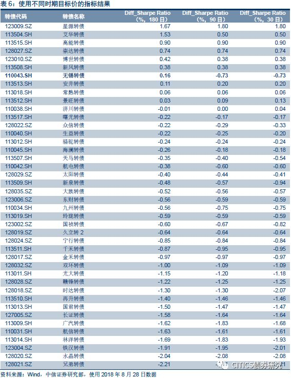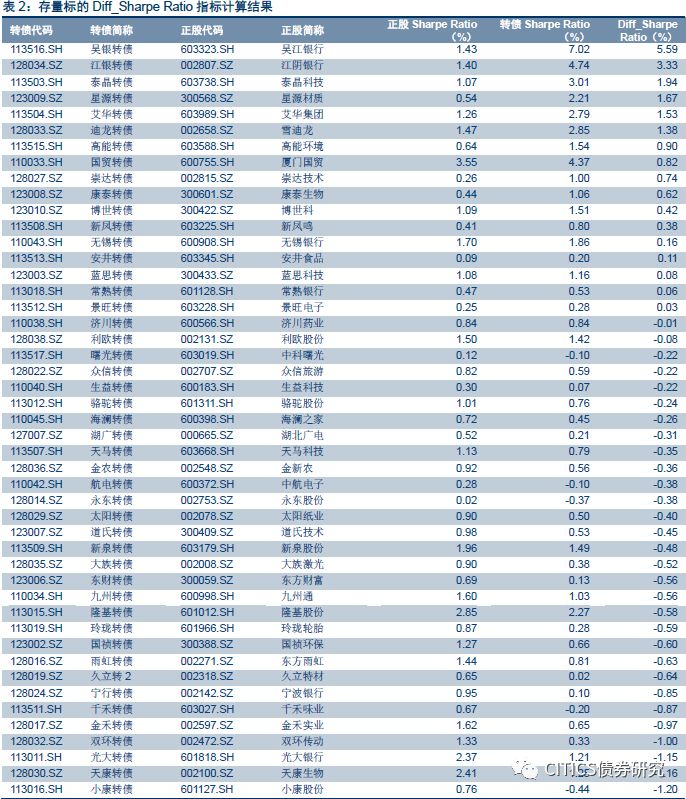 但单纯的考虑180日内一致预测目标价也存在一定的缺陷,对于转债这一类偏短期视角的投资标的而言,其对边际变化更为敏感,在市场调整幅度较大时,可能会出现高估或低估预期收益率的情况,此时Diff_Sharpe Ratio指标的最终结果将存在一定误区。我们单独测算了同时具有180日、90日、30日内所有机构预测数据的平均值的转债正股,在88只存量标的中仅有42只标的满足条件,明显削弱了模型的覆盖率。从计算结果来看,多数标的指标变化不大,唯有无锡转债的指标结果由负值变为正值,主要原因在于其一致预测目标价在近期有明显下调压缩了预期收益率。