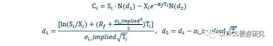 其中X_i表示转股价,S_i表示正股价,T_i代表剩余期限,R_f表示无风险利率。在Black-Scholes模型中,转债内嵌期权的价格是一个关于正股价格、剩余期限、波动率、无风险利率的四元函数。因而我们将当日个券对应的期权价格带入公式,通过二分法反复迭代得到近似当日的隐含波动率σ_i_implied。