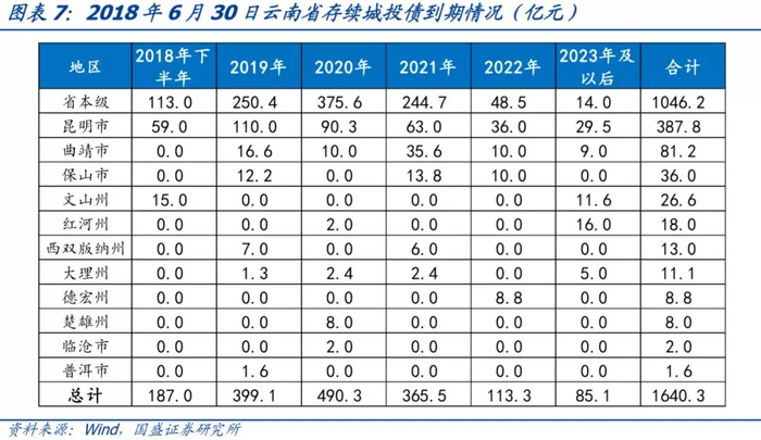 按照Wind口径,在人工剔除明显不是城投平台的公司后进行统计。截至2018年6月30日,云南省城投平台存量债余额为1640.3亿元,涉及发行人36个。分地区来看,云南省存量城投债以省本级为主,占比高达64%,其次是昆明市,占比24%。从回售或到期情况看,2019及2020年省本级和昆明市城投债回售或到期压力较大,分别为626亿元和200.3亿元,占比高达60%和52%。