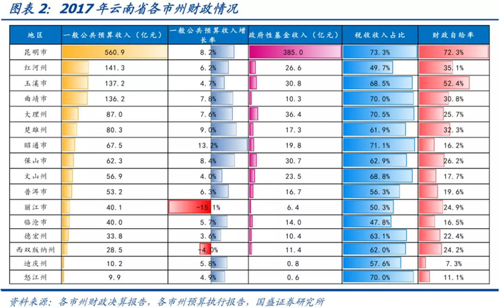 云南省各市州经济财政发展较不均衡,分化明显,省会昆明市遥遥领先,大体呈现出“中心强、四周弱”的格局。