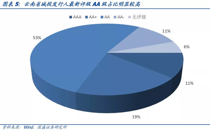 按照Wind口径,在人工剔除明显不是城投平台的公司后进行统计。截至2018年6月30日,云南省城投平台存量债余额为1640.3亿元,涉及发行人36个。从发行人最新评级来看,AAA级有4个、AA+级有7个、AA级有19个、AA-级有4个、无评级有2个,AA级占比明显较高,为53%。
