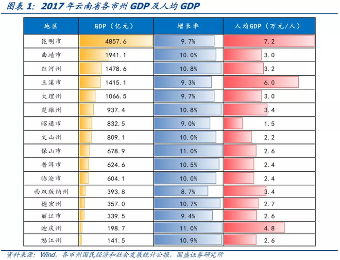 GDP增长率方面,云南各地GDP增长率普遍较高,保山市、怒江州、迪庆州GDP增长率位列前三,均为11%;玉溪市、昭通市、西双版纳州位列最后三位,分别为9.3%、9%、8.7%。人均GDP方面,只有昆明市和玉溪市超过5万元/人,大多数市州介于2-3万元/人,而昭通市仅为1.5万元/人。