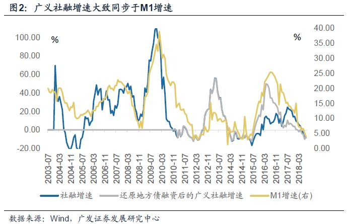 广义社融与M1大致同步,部分时段呈现领先性。社融实际上是从金融机构资产方的角度来衡量实体融资需求,因此它与M1和M2会呈现出经验上的相关性。2015年之后,地方债在事实上形成了一部分政府和企业部门的融资,将地方债发行加总到社融规模统计之后得到的广义社融与M1相关性更为显著,部分时段呈现领先性。
