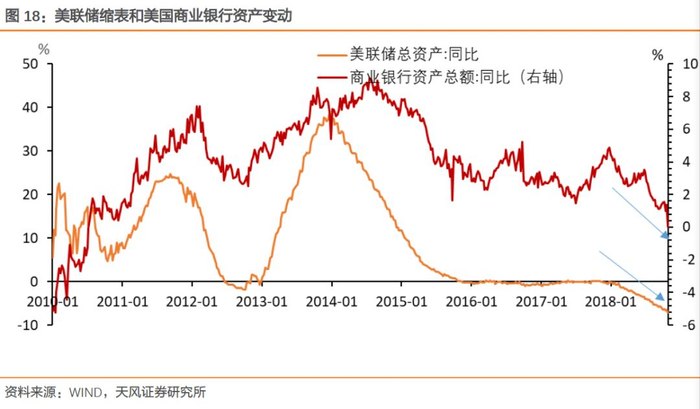 这种情况和美联储、商业银行资产的实际变化一致。美联储缩表带动商业银行缩表,从而使流动性环境收紧,加杠杆能力下降,间接推高了期限溢价。反过来商业银行的流动性收紧也会冲击个人投资者对国债的需求。