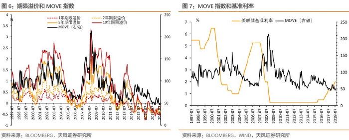 08年后,美国长期维持0基准利率,短期利率的波动空间受挤压,MOVE指数自然下降。随着美联储加息,短期利率的波动空间扩大。MOVE指数已经处于历史低位,进一步下降的空间不大。