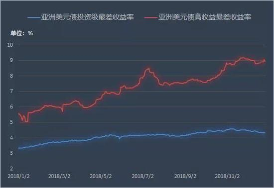 在中国去杠杆的大环境下,特别是2018年,中国宏观经济层面不确定性增强,中资企业融资异常艰难,此外美联储四次加息、美元走强,贸易摩擦等外部因素,中资美元债信用利差不断上行,近期已处于近几年的高位水平,信用利差已经打开,未来下行空间比上行空间更大。中资美元高收益债信用利差在高位,风险正处于持续释放的状态中,目前中资美元高收益债券收益率至9%左右,这个信用利差下,相关产品因较低的估值而吸引力大增。通过历史数据可知,每次信用利差到了9%附近,未来一段时间内中资美元债都会有比较好的收益率。以亚洲美元债信用利差走势为例,其指数主要成分股中资企业占有较大权重。当美元走势强劲时,该债券的信用利差同时会出现幅度较大的增长,并触及历史高点附近。如果在这个基础上选择合适的债券,给投资者带来的回报也会非常可观,特别是相对国内债券的收益率。