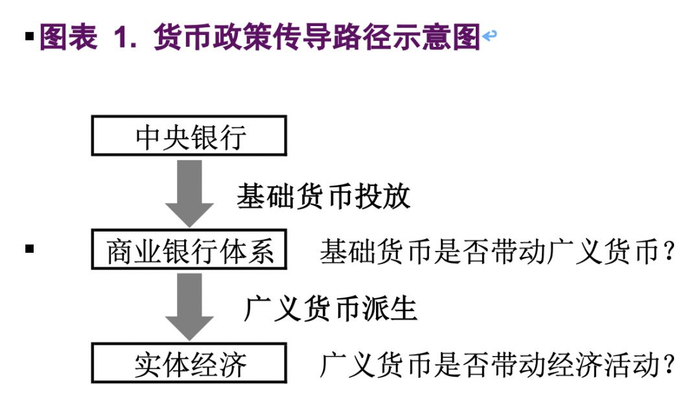 因为货币政策传导路径有两个环节,所以央行的货币扩张是否能带动实体经济中经济活动的活跃,就要看在两个节点上传导是否顺畅:其一,是央行的基础货币投放是否能带来商业银行体系广义货币的派生;其二,是商业银行广义货币的派生是否能够带来实体经济的活跃。如果在第一个节点衔接不顺畅,就可以认为基础货币投放碰到了流动性陷阱——更多的基础货币不能带来广义货币的相应扩张。而如果在第二个节点衔接不畅,就可以认为广义货币投放碰到了流动性陷阱——更多的广义货币无法刺激经济活动。(图表 1)