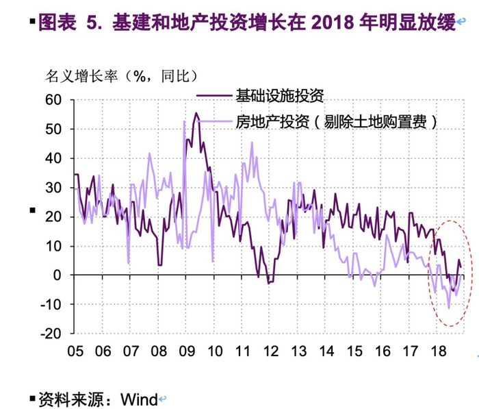 另一方面,是地方政府去杠杆政策和地产调控政策对实体经济融资需求的打压。基础设施投资和地产投资各占我国总投资的约1/4,合起来占据了投资的半壁江山。从2017年开始,在控制地方政府债务扩张的导向下,地方政府(通过地方政府融资平台进行)的融资在政策压力下明显走低。同时,地产开发商获得的融资支持也因为地产调控政策收紧而明显走弱。由于这二者是实体经济中最重要的两类融资需求主体,对其融资需求的政策性抑制使得金融机构向实体经济的融资投放变得困难。在这样的背景下,基础设施投资和地产投资的增速在2018年明显走低,成为我国经济增长下行压力的重要来源。(图表 5)