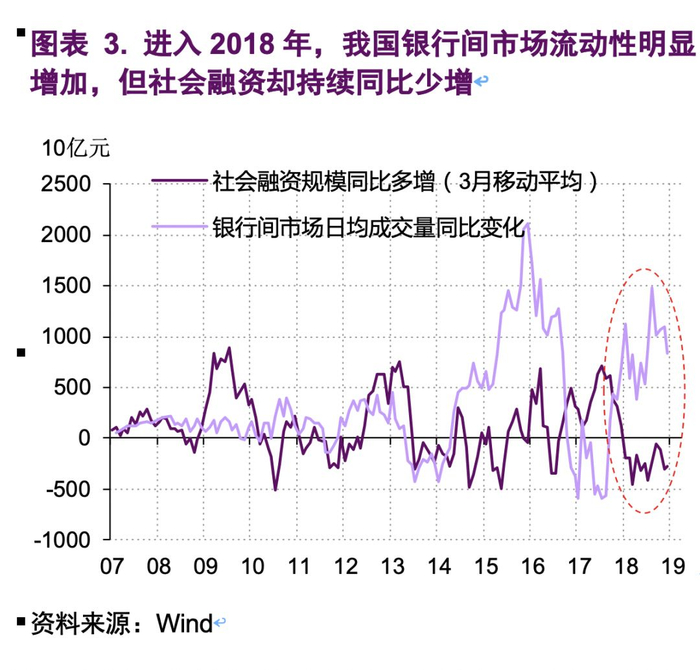很显然,人民银行在2018年投放的基础货币并未带来广义货币的相应扩张。在从基础货币到广义货币的传导上,货币政策出现了阻塞。换言之,我国在这个节点上碰上了流动性陷阱。(图表 3)