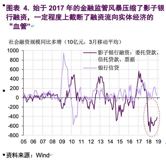 一方面,过于严厉的金融监管政策阻塞了融资流向实体经济的渠道。始于2017年的金融监管风暴在试图防控金融风险的同时,其负面效应也在逐步体现。金融强监管措施的持续出台,尤其是“资管新规”的颁布,给了之前曾相当活跃的影子银行业务当头一棒。影子银行业务虽然带来了一定的潜在金融风险,但也要一分为二地看到其积极的一面——它们的确为实体经济提供了不少创新型的融资渠道。对于那些在传统信贷业务中不占优势的民营企业来说,这些新型融资渠道具有更大价值。不过,在强监管“一刀切”式的打压下,影子银行融资在2018年大幅收缩,从而明显拉低了社会融资规模的增长。在这个过程中,民营企业受伤尤其深。(图表 4)