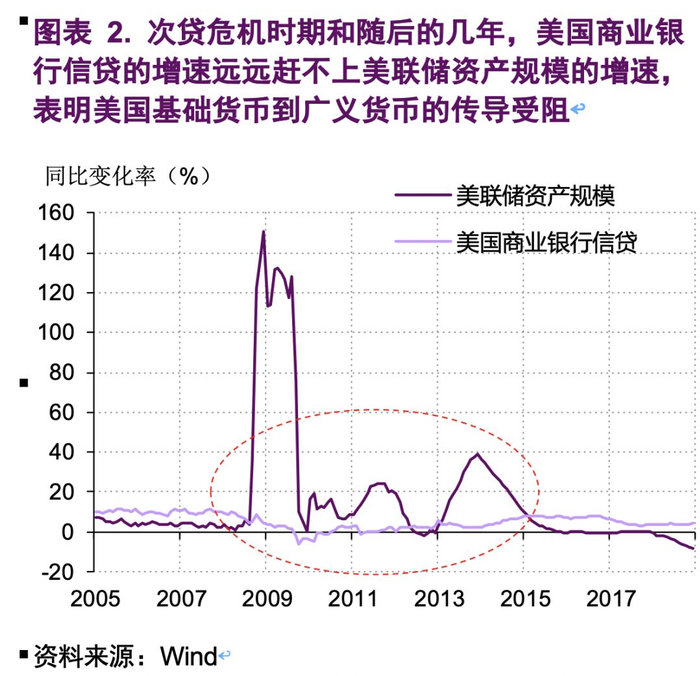 在凯恩斯时代,对货币政策的研究还远不如现在那么精细,货币政策传导路径也并不为人所重视。所以在凯恩斯的论述中并未区分前述的两个节点。在其《通论》中,凯恩斯更多是从利率下降到较低水平后,人们的流动性偏好变得极大来论述流动性陷阱的,对应的是前面所说的广义货币到经济活动的阻塞。而在当前的现实世界中,从基础货币到广义货币的传导更容易受阻。次贷危机爆发后的几年,美联储在基础货币到广义货币的传导上碰到了阻塞——商业银行的信贷增速却长期大幅低于美联储资产规模的增长,表明美联储的基础货币投放(伴随美联储资产的扩张)并未带动银行信贷的相应增长。可以说,这段时间的美联储碰到了流动性陷阱(图表 2)