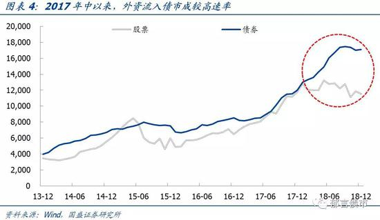 在CIBM和“债券通”的顺利运行下,海外投资者进入中国债市的难度大大降低,外资流入速度自2017年第6月开始明显加速。进入2018年后,流入中国债市的外资规模仍保持着高速增长的趋势,2018年1-12月流入规模为5127.6亿。