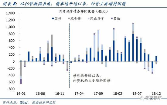截止12月,国内外资持有的国债规模为10590亿,政金债规模为3420亿,合计14011亿人民币。而2018年1月-12月国债和政金债的合计流入量为4049亿元,1000亿美元(约6700亿元)的外资流入规模超过这一增量,这也就意味着纳入指数带来的直接资金流入规模较为可观。